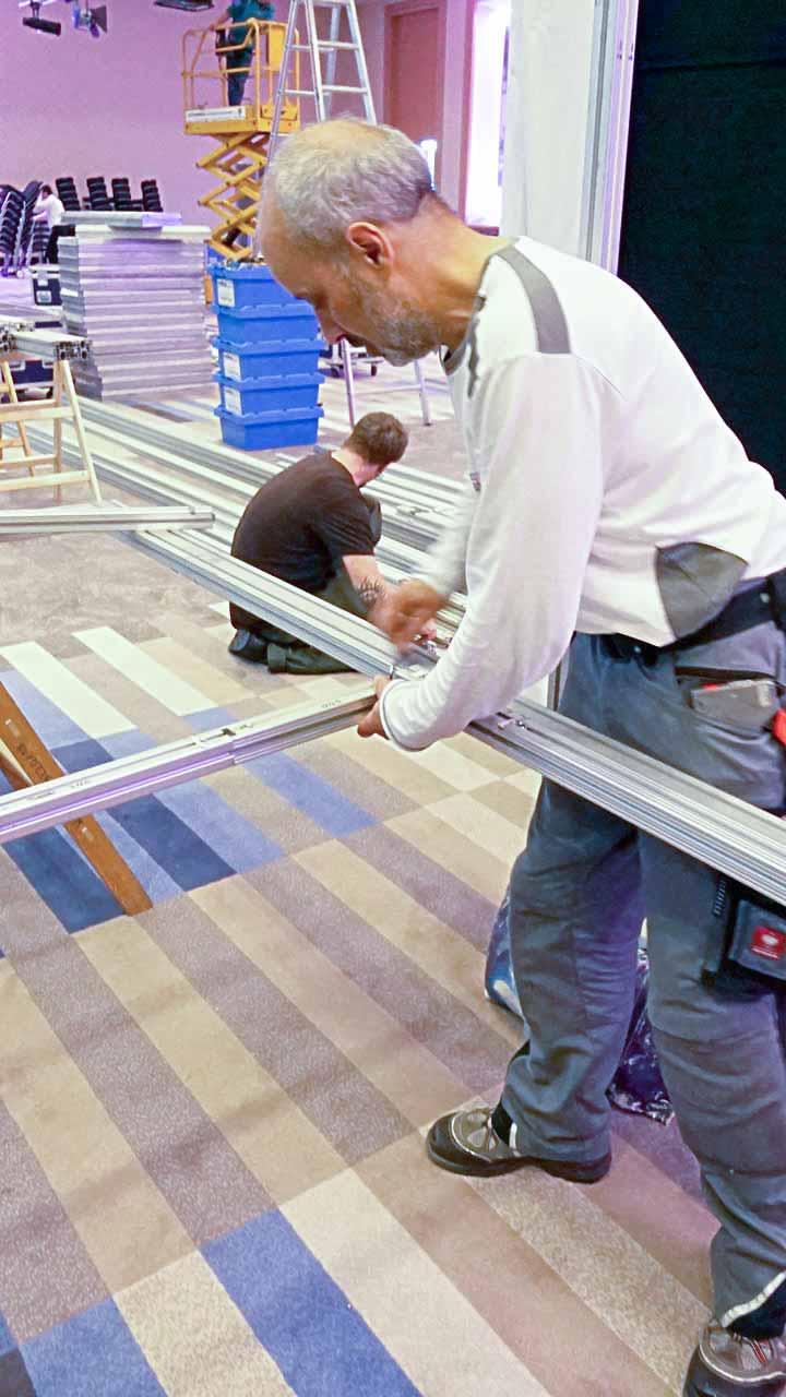 Das Bühnenwandsystem von BÜHNTEC® ist dank des eingesetzten, handelsüblichen Aluminiumsystems und der von uns entwickelten Stückelung, schnell auf- oder umgebaut.
